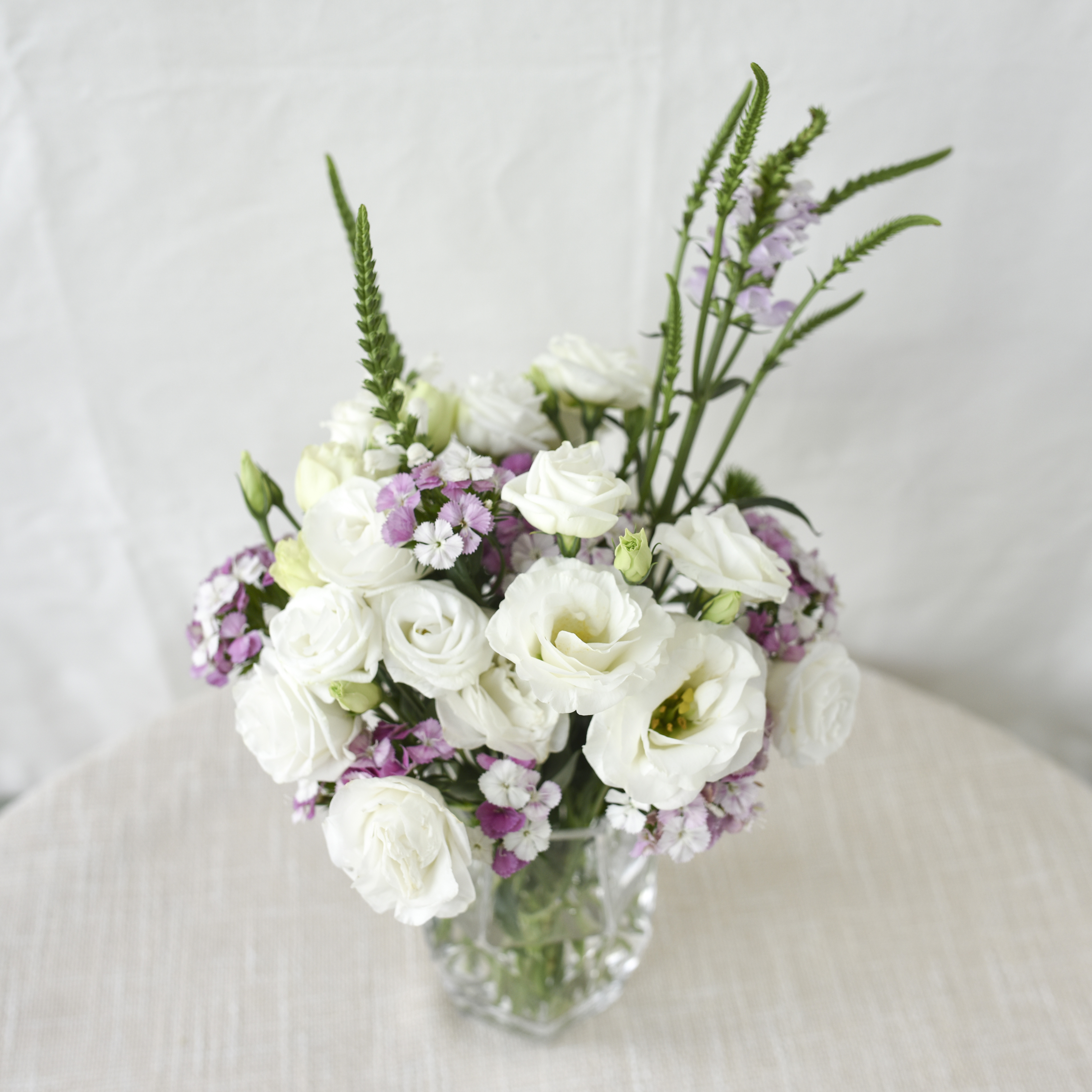 这一期,原气花铺应景地推出了一款清爽的花材套装:主花材是轻盈的裙边花瓣白色洋桔梗,辅以绝配白色随意草和用于点睛的粉紫色相思梅~