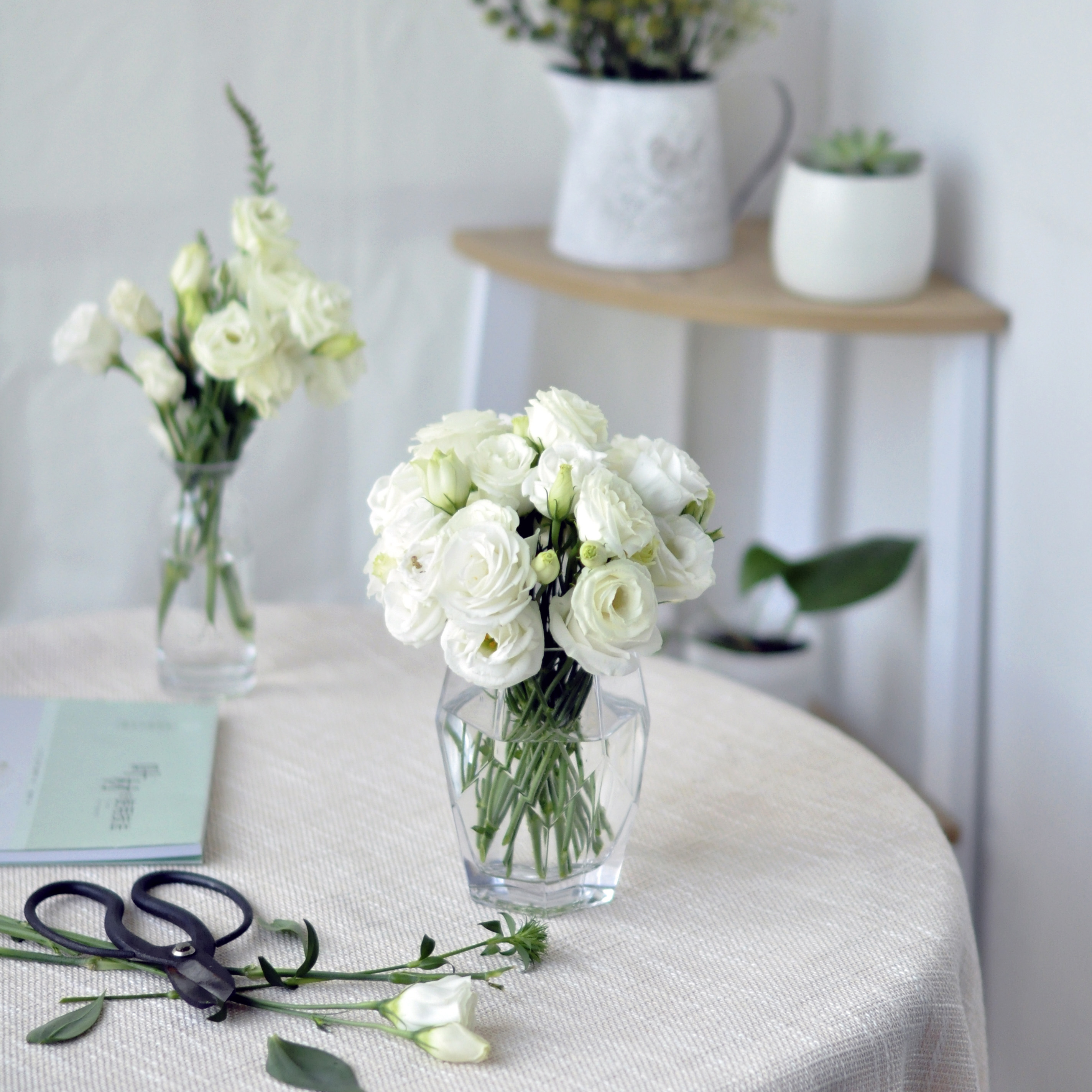 洋桔梗春天播种,夏天开花,现在正是最新鲜、最生机勃勃的时候!她的花瓣并不密集,波浪边就像小姑娘的裙子,给人十分轻盈的感觉~我们特意选择了干净透亮的白色,这样的颜色与花瓣一看就让人觉得十分舒爽呢!